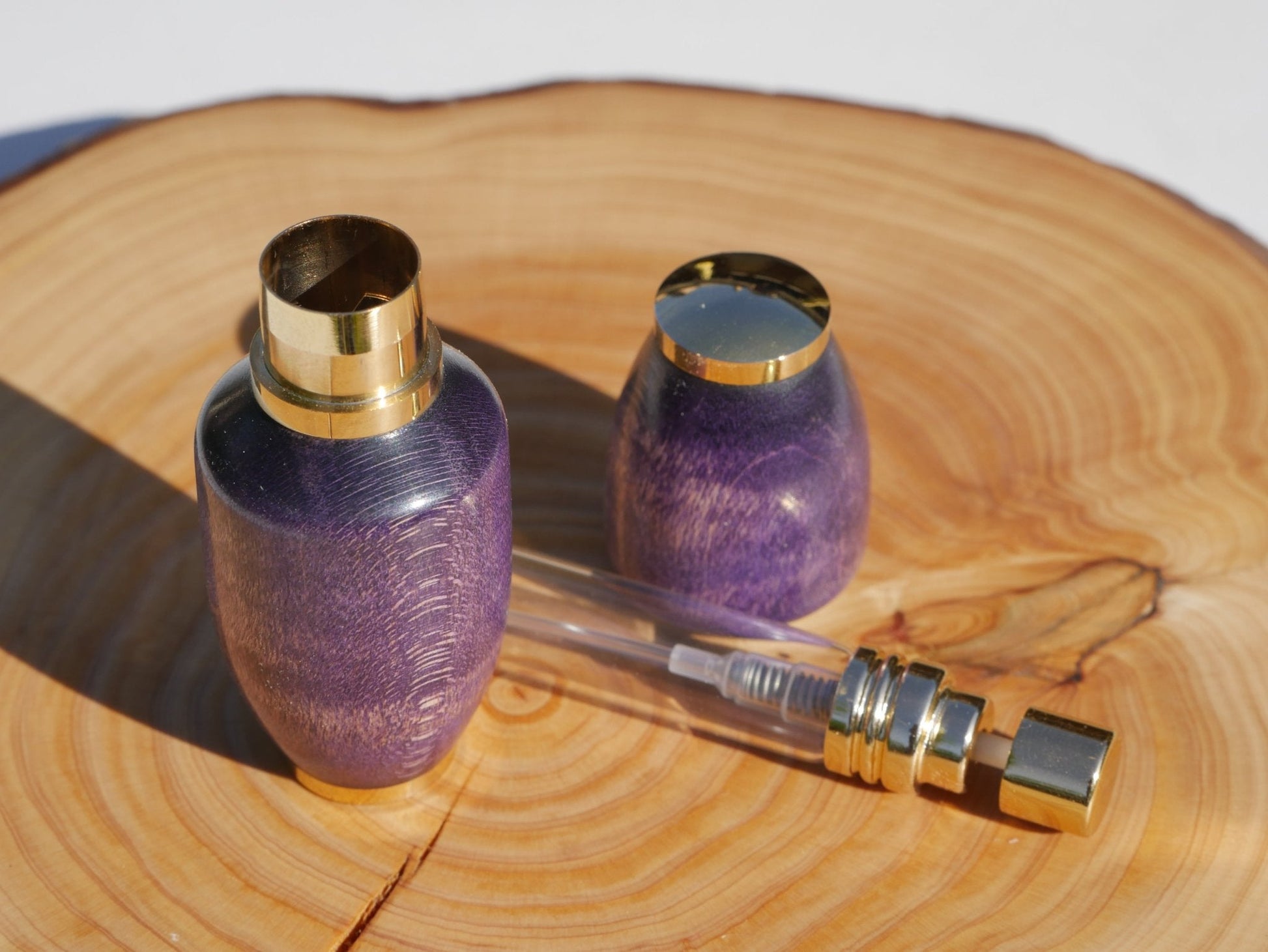 Notre atomiseur à parfum en érable ondé teinté violet est l'accessoire idéal pour vos fragrances.