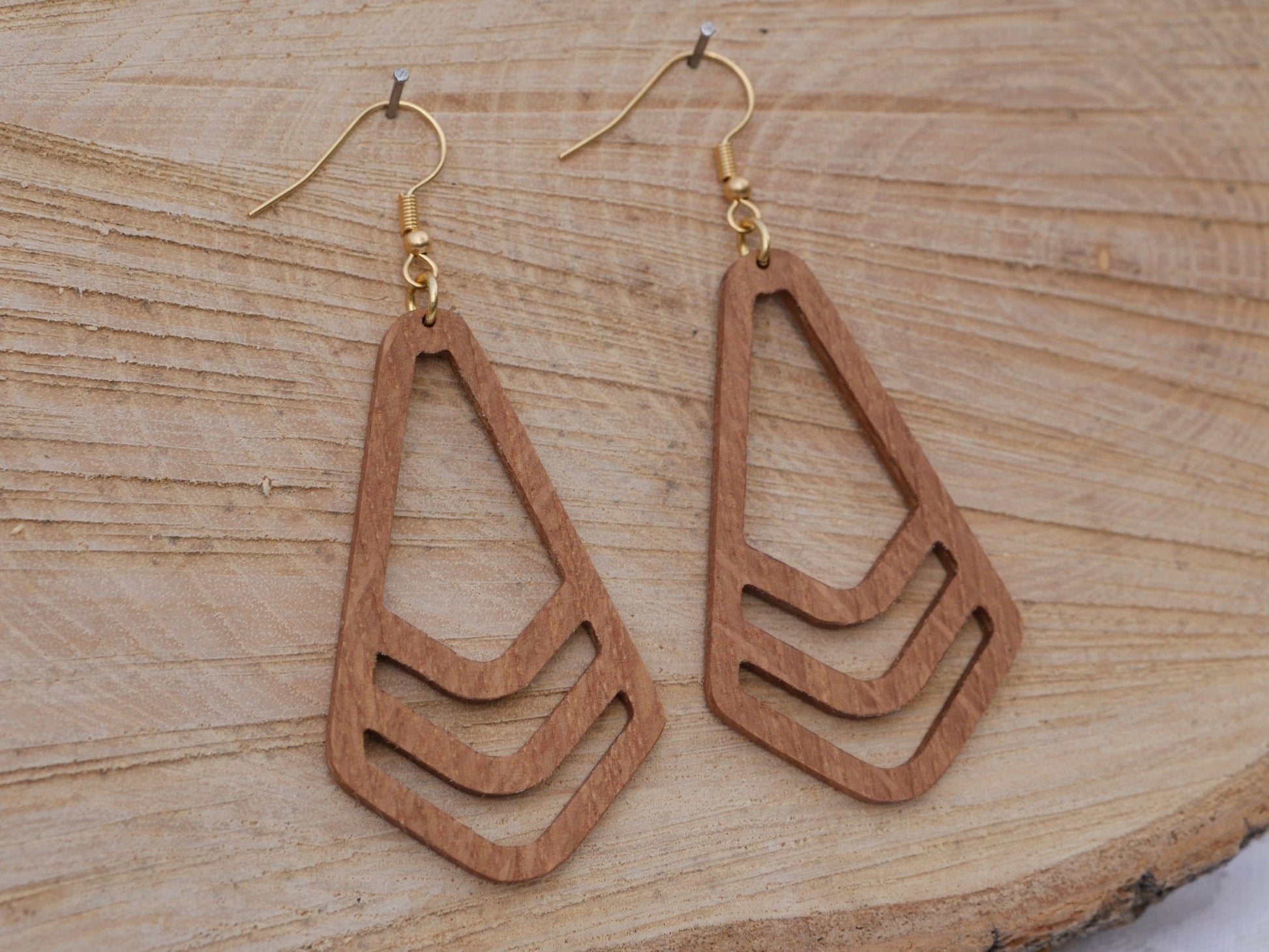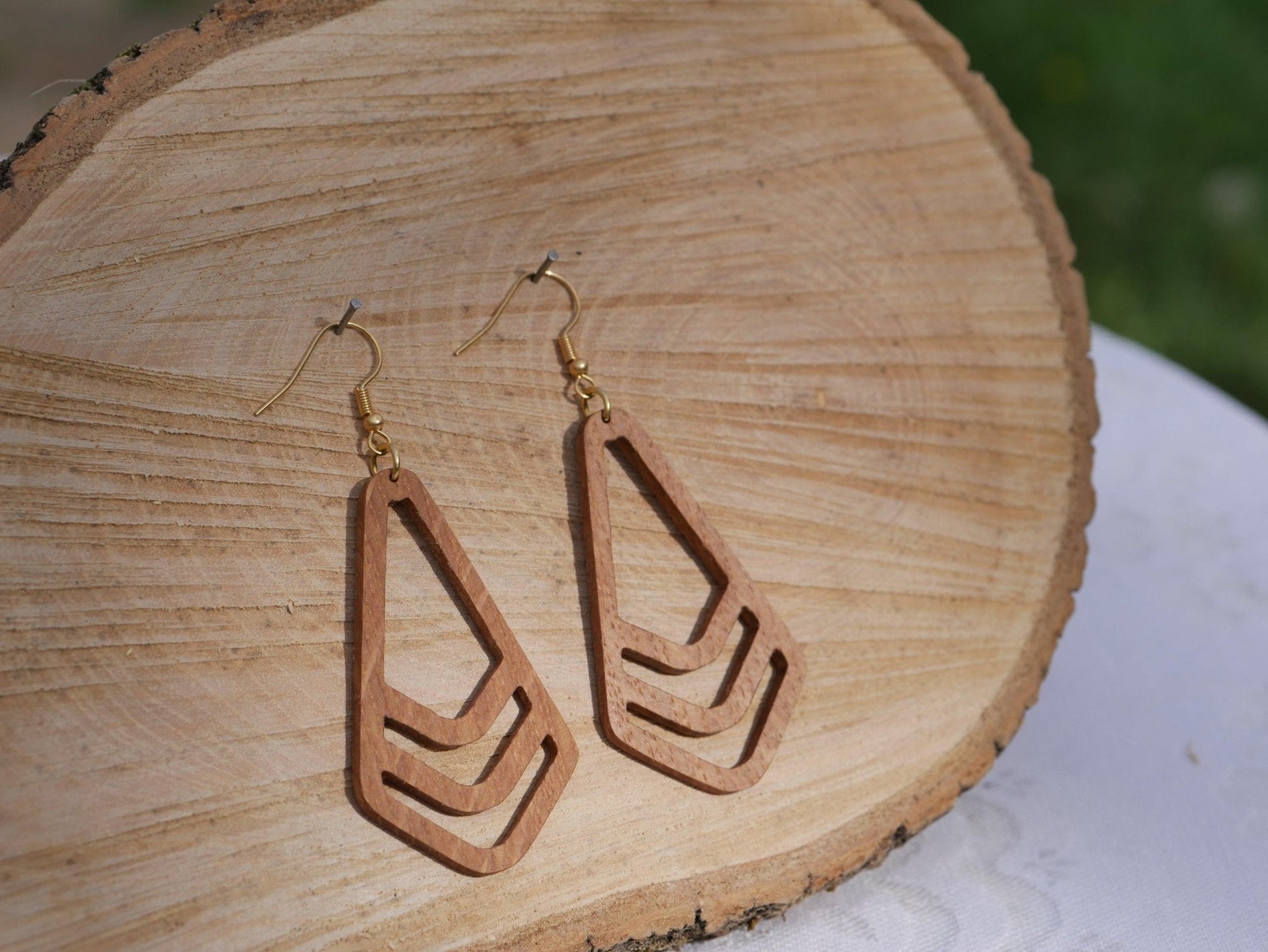 Boucles d'oreilles en bois d'origine locale, en forme de fusée.