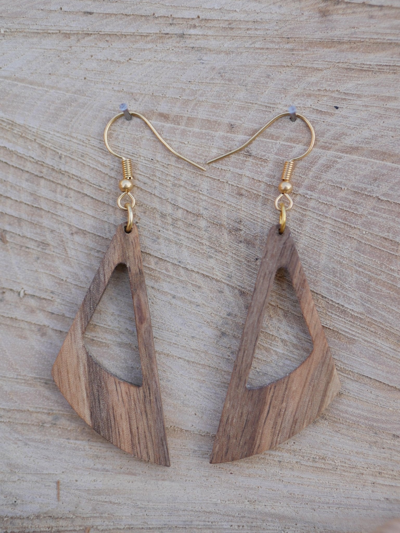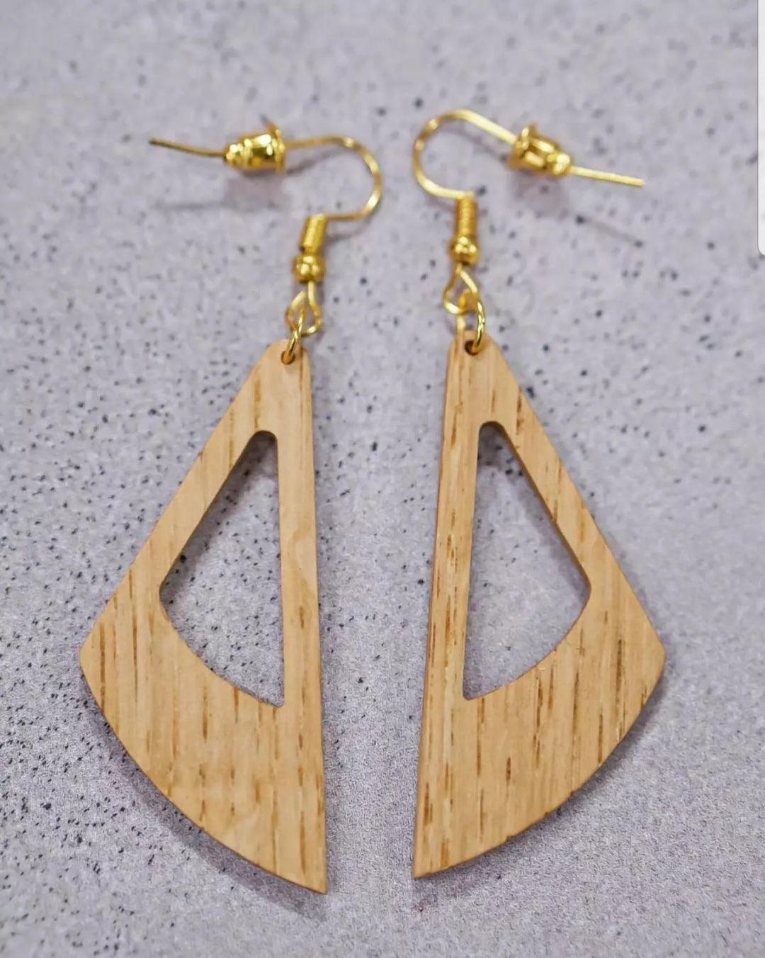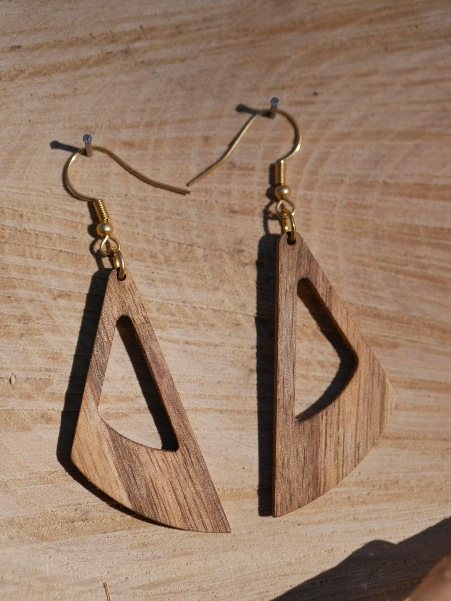 Boucles d'oreilles en différentes variétés de bois local, de forme triangulaire et asymétriques.