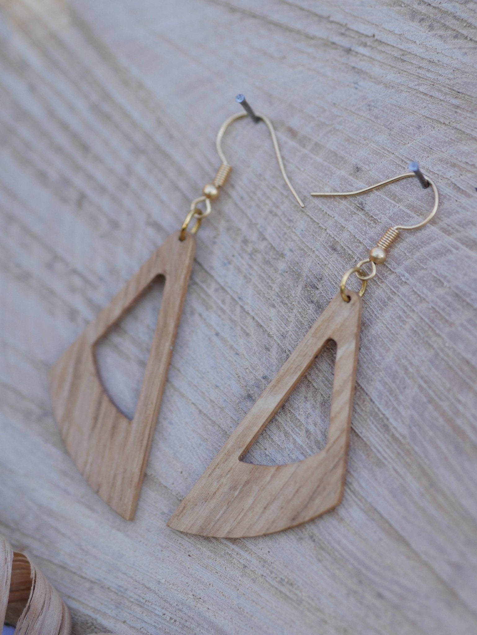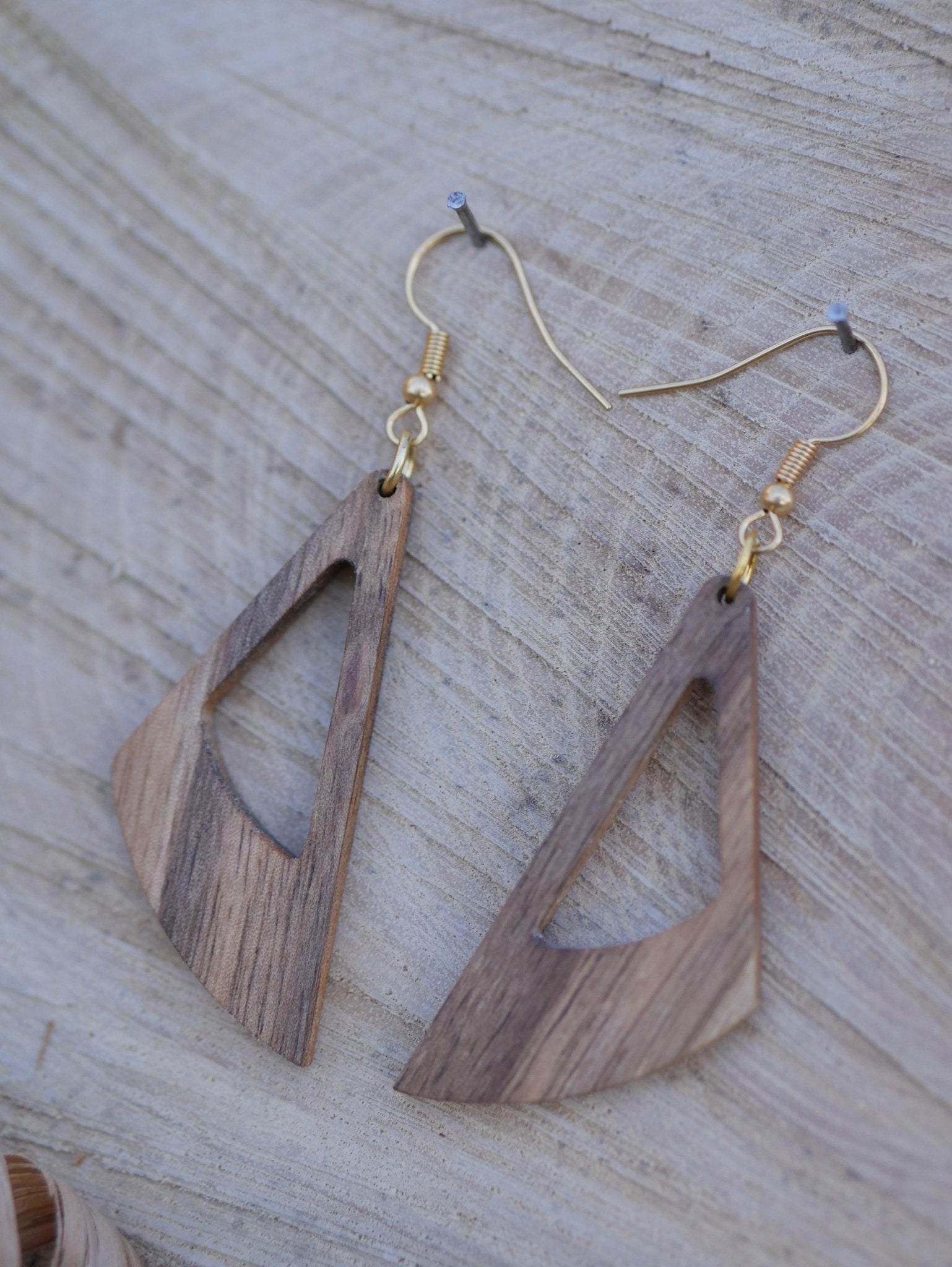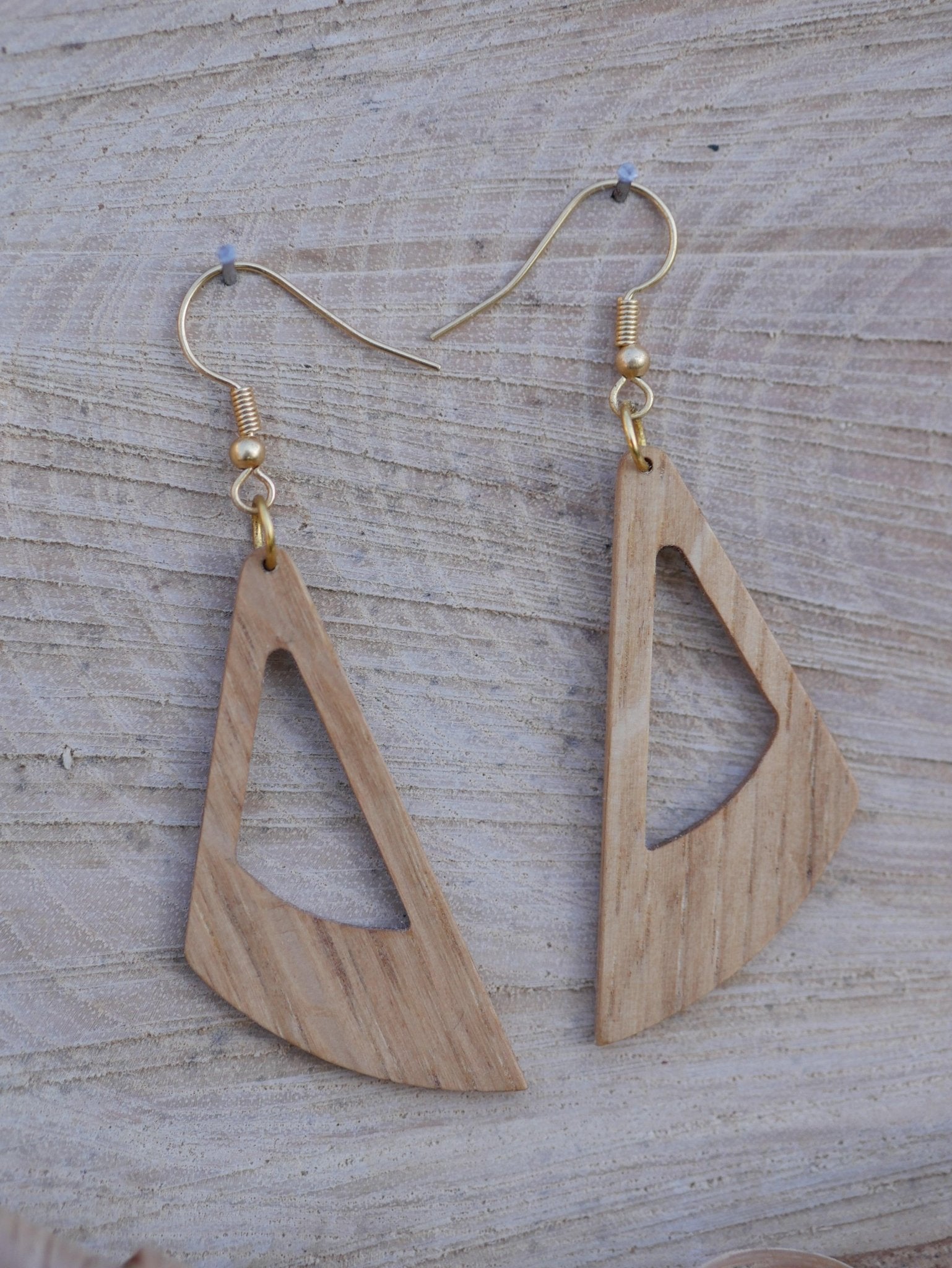 Boucles d'oreilles en différentes variétés de bois local, de forme triangulaire et asymétriques.