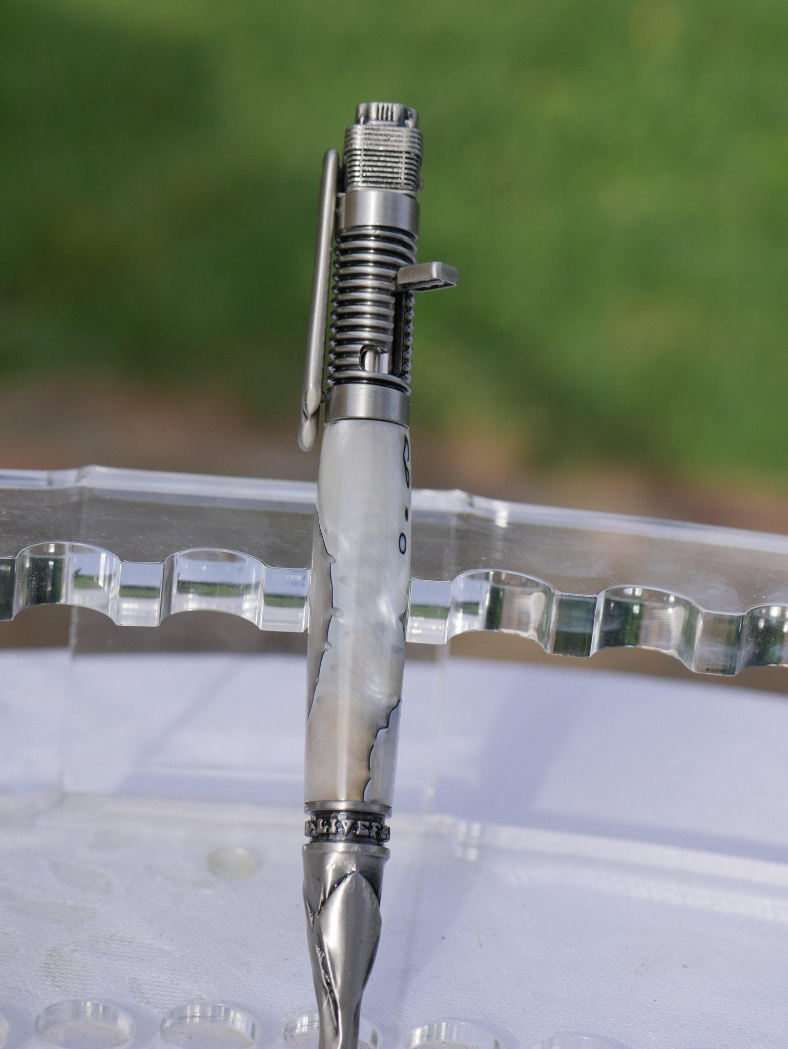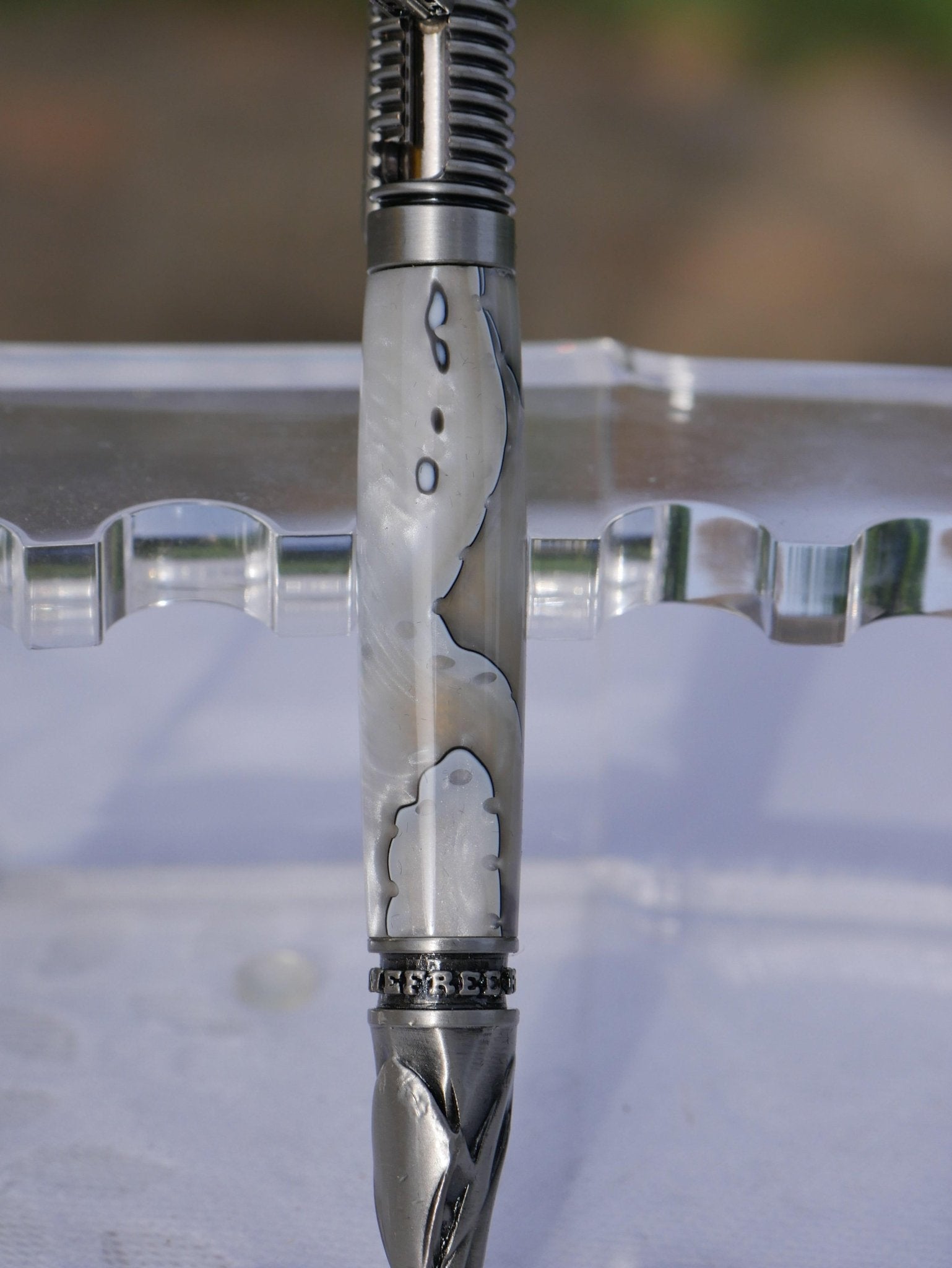 Modèle ici présenté en résine nacrée avec trame argent.